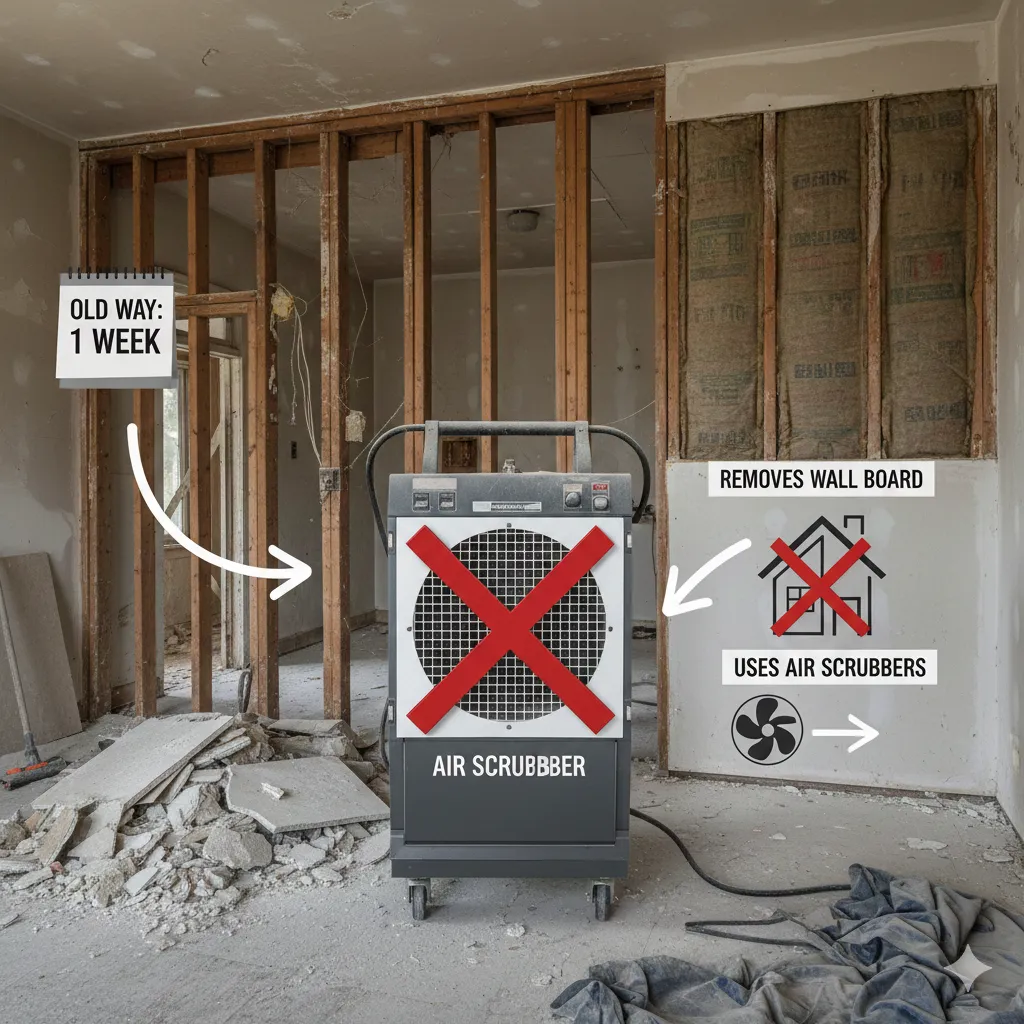 “The old way takes 1 week, removes the wall board and uses an air scrubbers .”